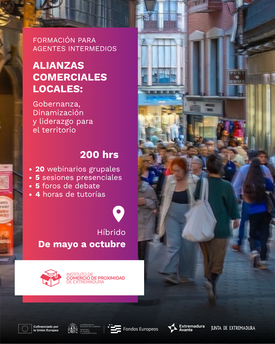 Extremadura Avante con el apoyo de la Junta de Extremadura organiza en el marco del programa del Instituto de Comercio de Proximidad de Extremadura, un curso de formación especializada en “Alianzas Comerciales Locales: Gobernanza, Dinamización y liderazgo para el territorio”, que se celebrará a partir del mes de mayo de 2026.