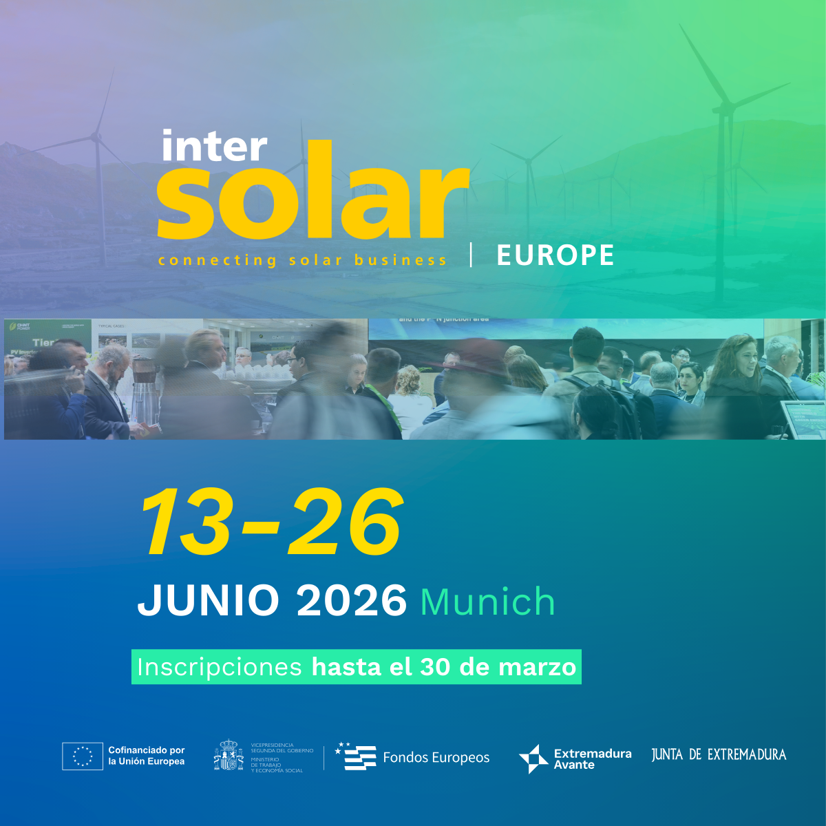 Extremadura Avante estará presente con un stand de representación autonómica para la promoción del sector energético y de energías renovables de Extremadura, en la próxima edición de la feria internacional Intersolar Europe, que tendrá lugar en Múnich (Alemania) del 23 al 25 de junio de 2026.La presencia estratégica comercial en acciones de promoción tiene como finalidad asegurar la representación de Extremadura en eventos internacionales de referencia, a través de un stand institucional donde se expondrán los valores, recursos, productos, servicios y capacidades tecnológicas de la región, contribuyendo así a mejorar la proyección económica y la imagen de Extremadura a nivel internacional.Para ello se contará con un espacio expositivo representativo de la región, desde el que se promocionará el sector energético extremeño, especialmente vinculado a las energías renovables, la innovación tecnológica y la transición energética, así como el conjunto del ecosistema empresarial de Extremadura.