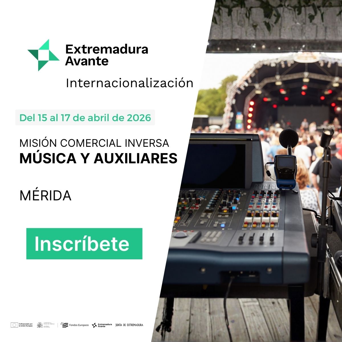 Extremadura Avante, en colaboración con el Centro de las Artes Escénicas y de la Música (CEMART), organiza una Misión Comercial Inversa del sector Música y Servicios Auxiliares, que se celebrará en Mérida del 15 al 17 de abril de 2026, en el marco de las Jornadas Profesionales de la Música en Extremadura (MUM).