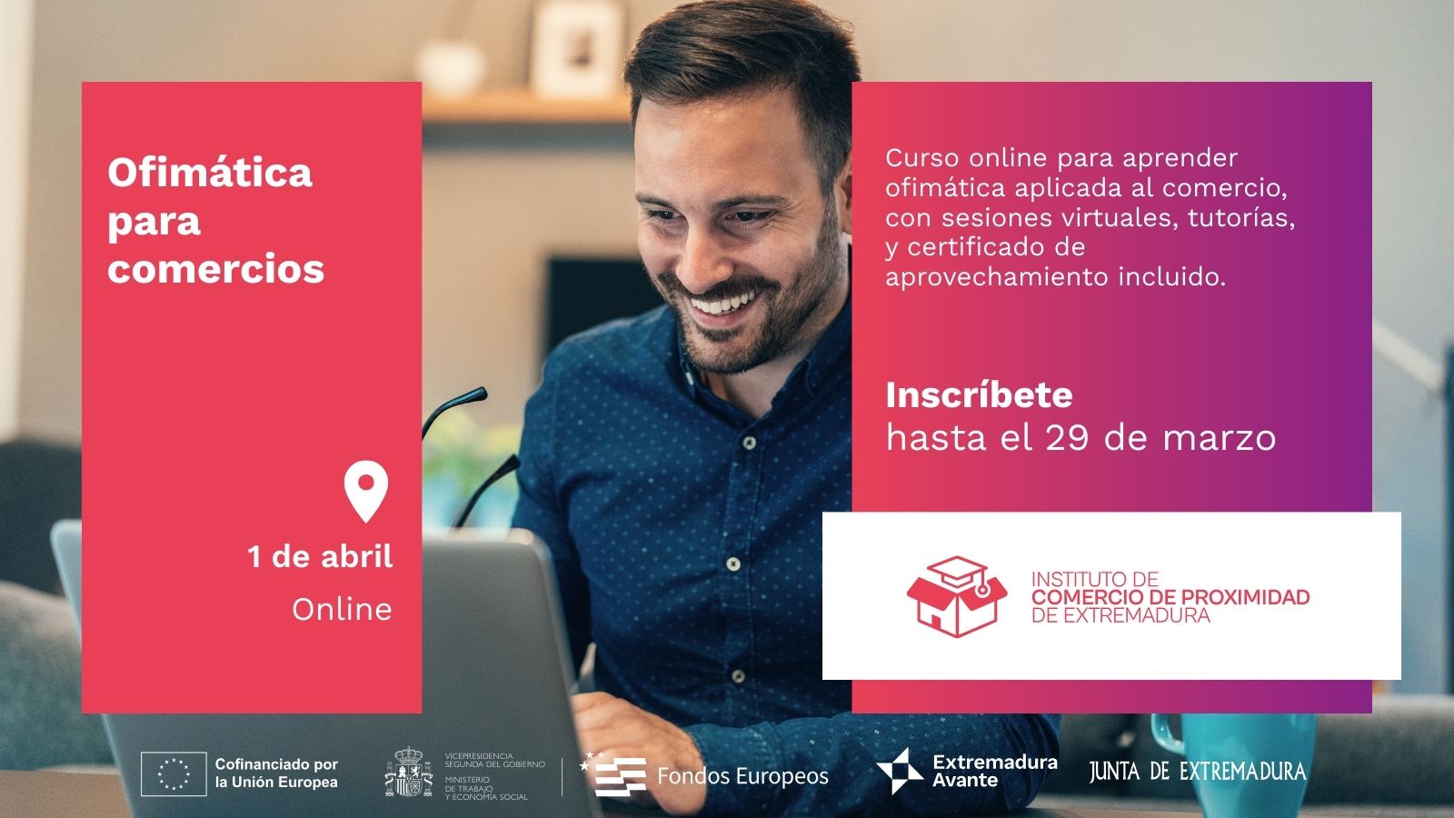 Extremadura Avante con el apoyo de la Junta de Extremadura organiza en el marco del programa del Instituto de Comercio de Proximidad de Extremadura la formación “Ofimática para Comercios”, que se desarrollará a partir del mes de abril de 2026.