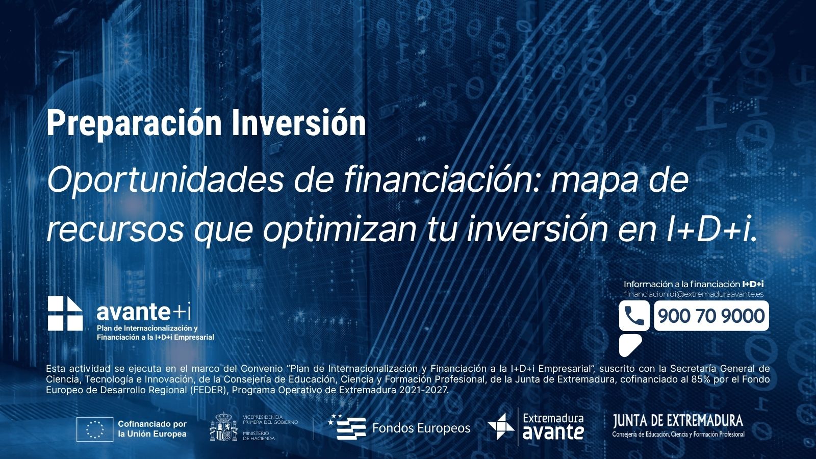 Extremadura Avante Servicios Avanzados a Pymes S.L.U., a través del Plan de Internacionalización y Financiación a la I+D+i empresarial, pone en marcha el ciclo de formación online de Sesiones de Preparación para la Inversión, con carácter semanal, diseñado para fortalecer las capacidades de las empresas extremeñas, especialmente pymes y agentes del SECTI, en la planificación estratégica de sus inversiones.