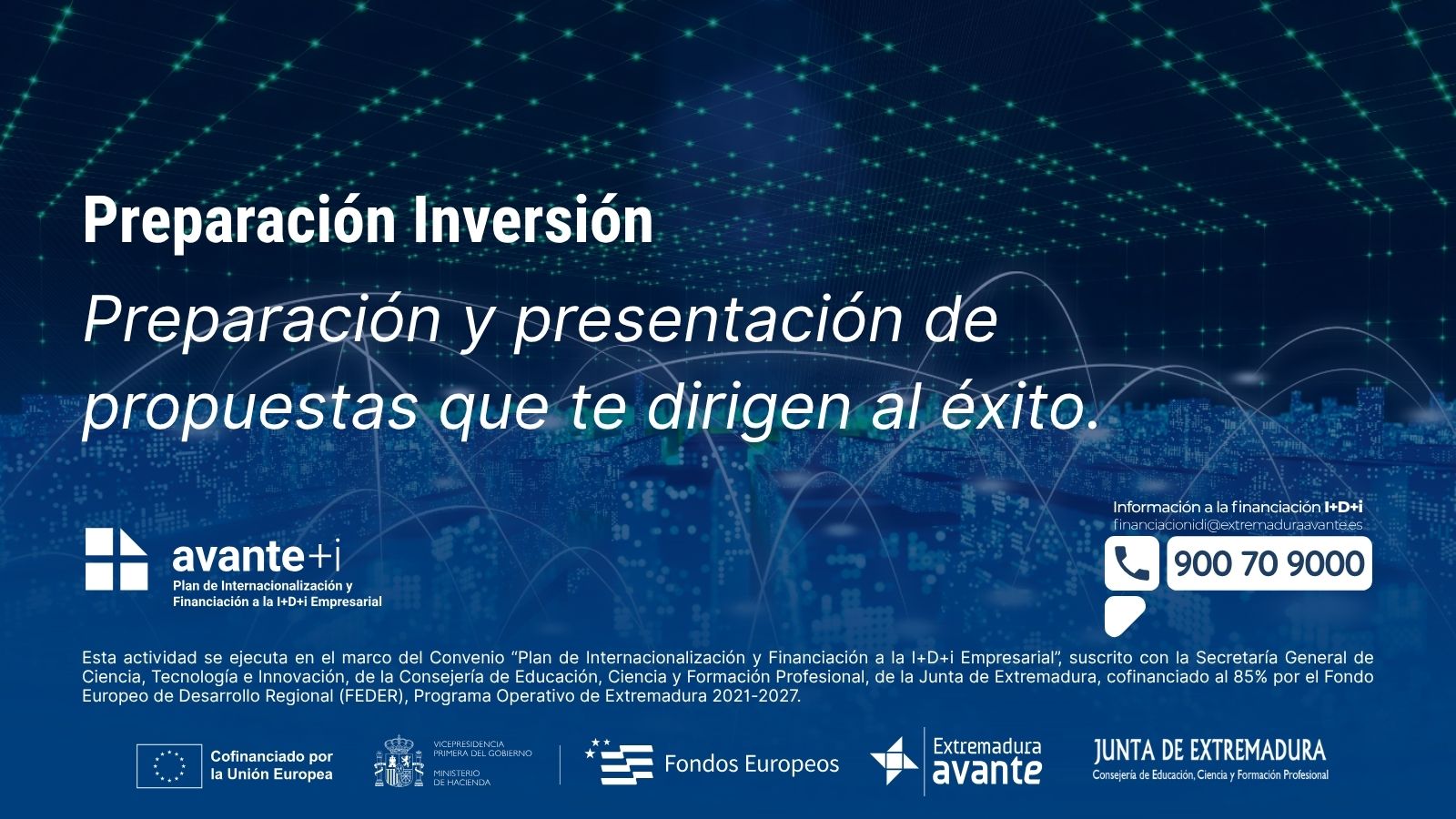 Extremadura Avante Servicios Avanzados a Pymes S.L.U., a través del Plan de Internacionalización y Financiación a la I+D+i empresarial, pone en marcha el ciclo de formación online de Sesiones de Preparación para la Inversión, con carácter semanal, diseñado para fortalecer las capacidades de las empresas extremeñas, especialmente pymes y agentes del SECTI, en la planificación estratégica de sus inversiones.