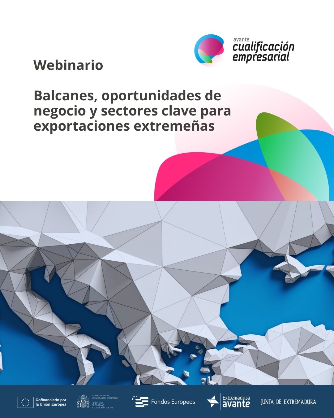 Extremadura Avante organiza el seminario online “Balcanes, oportunidades de negocio y sectores clave para exportaciones extremeñas”, que se desarrollará el martes 30 de septiembre en horario de 11.00 a 13.00 horas, en el marco del programa de Cualificación Empresarial para la Exportación 2025, actividad cofinanciada por el programa FSE+ Extremadura 2021-2027.