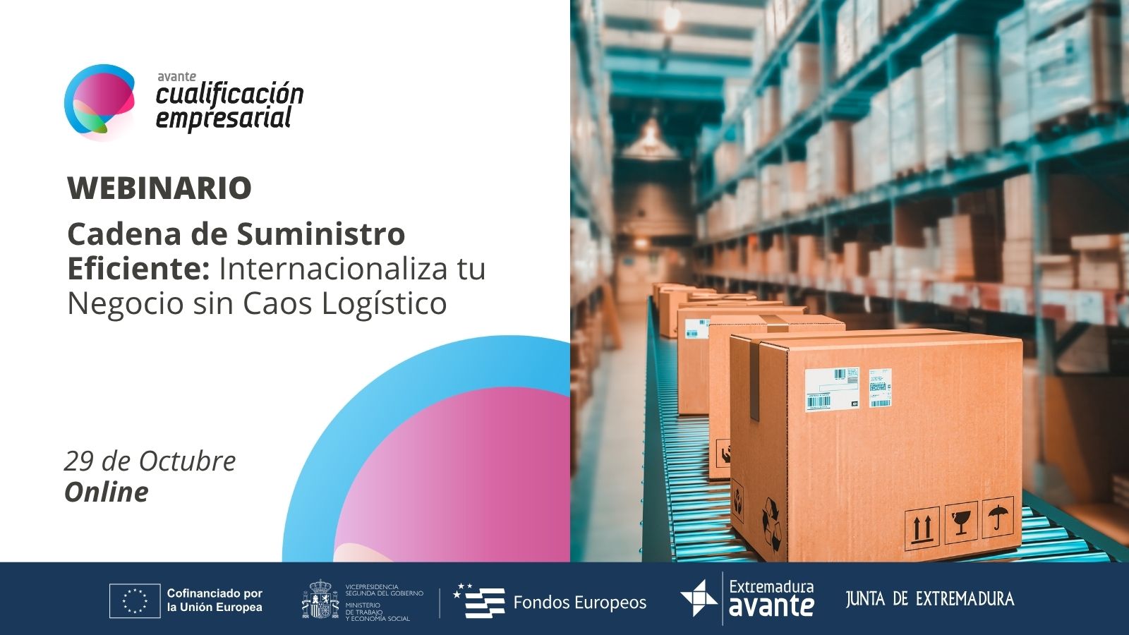 Extremadura Avante organiza la jornada online “Cadena de Suministro Eficiente: Internacionaliza tu Negocio sin Caos Logístico” que se desarrollará el miércoles 29 de octubre en horario de 11.00 a 13.00 horas, en el marco del programa de Cualificación Empresarial para la Exportación 2025, actividad cofinanciada por el programa FSE+ Extremadura 2021-2027.