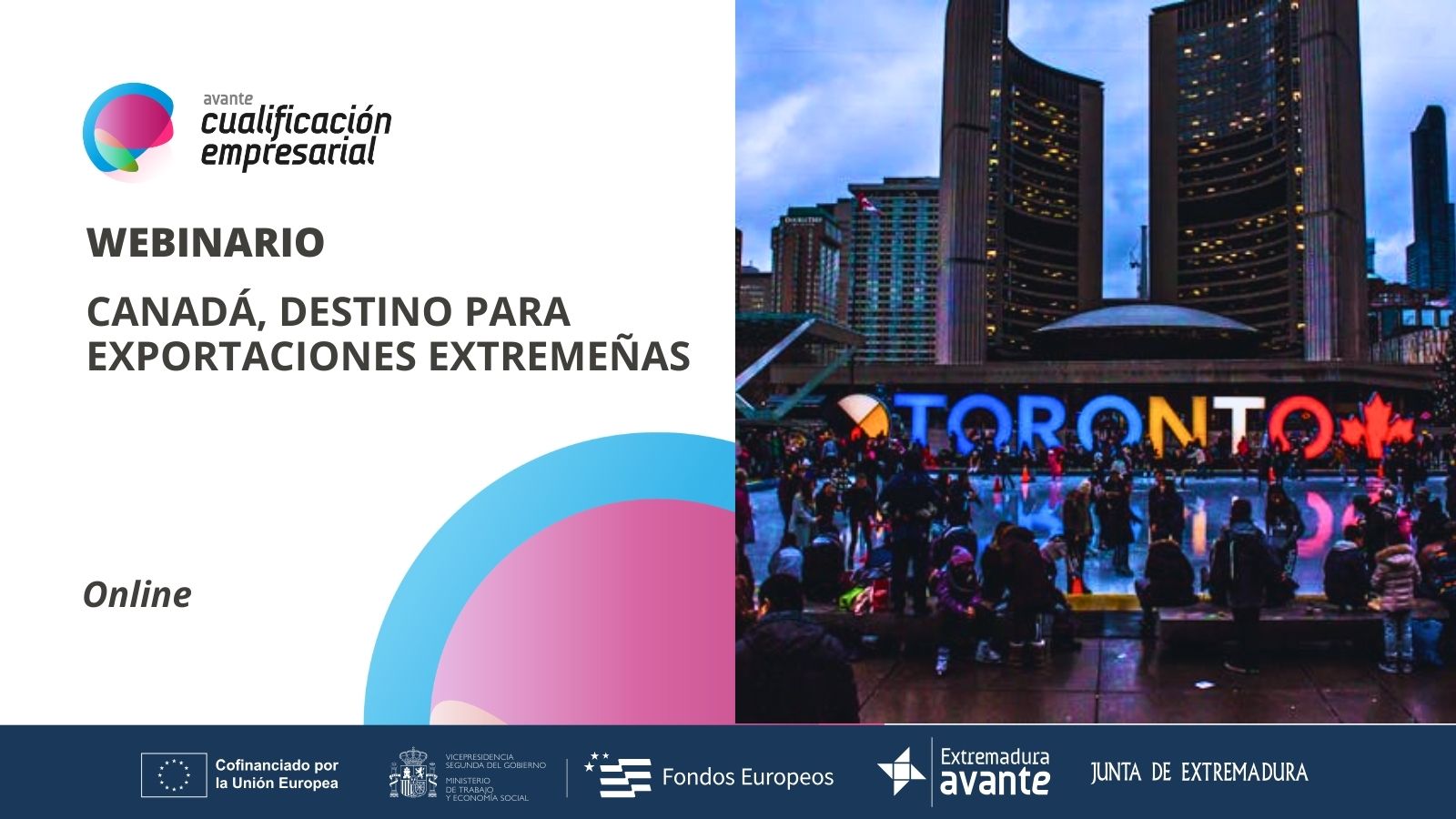 Extremadura Avante organiza el seminario online “Canadá, destino para exportaciones Extremeñas”, que se desarrollará el jueves 25 de septiembre en horario de 16.00 a 17.30 horas, en el marco del programa de Cualificación Empresarial para la Exportación 2025, actividad cofinanciada por el programa FSE+ Extremadura 2021-2027.