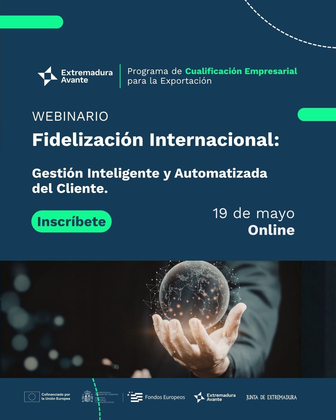 Extremadura Avante organiza la jornada online “Fidelización Internacional: Gestión Inteligente y Automatizada del Cliente”, que se desarrollará el martes 19 de mayo 2026 en horario de 11.00 a 13.00 horas; en el marco del programa de Cualificación Empresarial para la Exportación 2026, actividad cofinanciada por el programa FSE+ Extremadura 2021-2027.